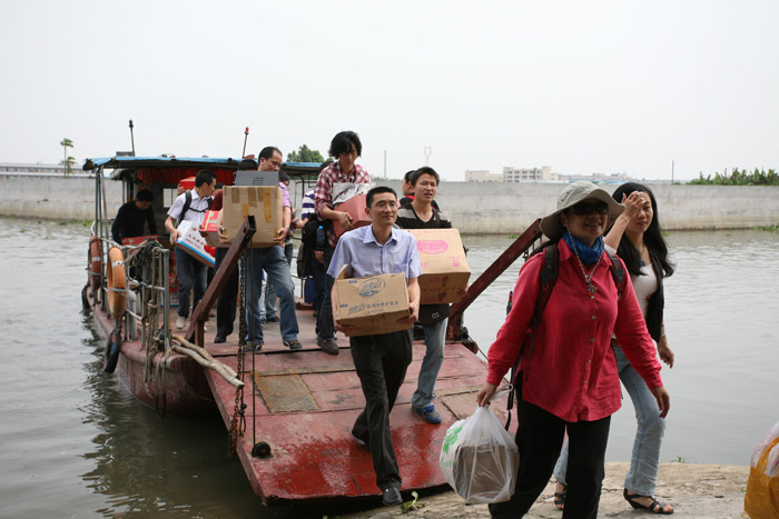 我們分批坐船過(guò)島.船靠岸了,我們?cè)诎徇\(yùn)給老人帶品.