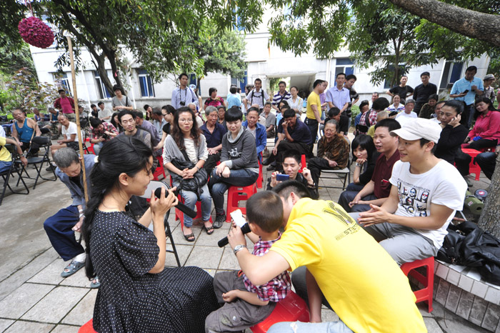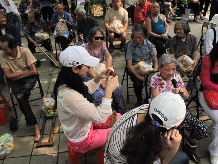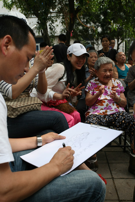 三米老師專心的在為美女婆婆畫(huà)肖像,她開(kāi)心的鼓起掌來(lái)。