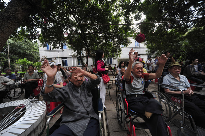 老人們跟著節(jié)拍揮舞著雙臂,很開(kāi)心。