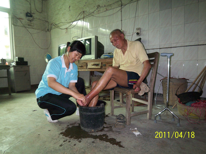 年輕的姑娘在幫老人洗腳,溫馨的畫(huà)面。