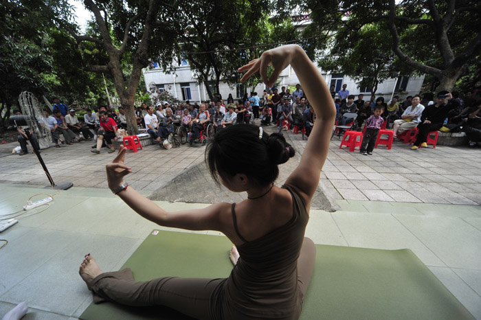 瑜伽老師教老人簡(jiǎn)單的動(dòng)作,讓他們靈活自己的身體,增強(qiáng)體質(zhì)。