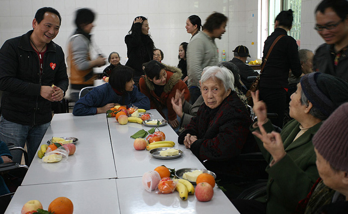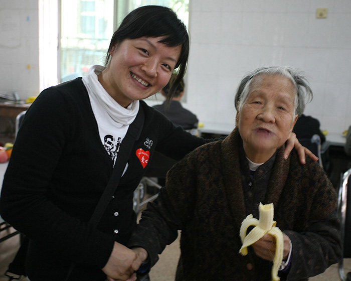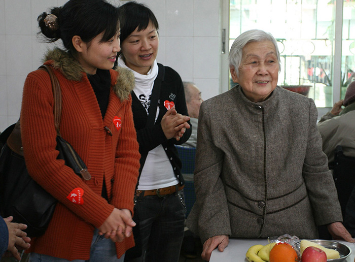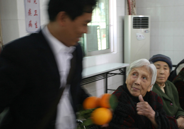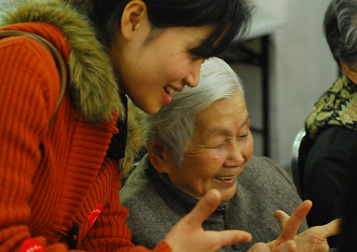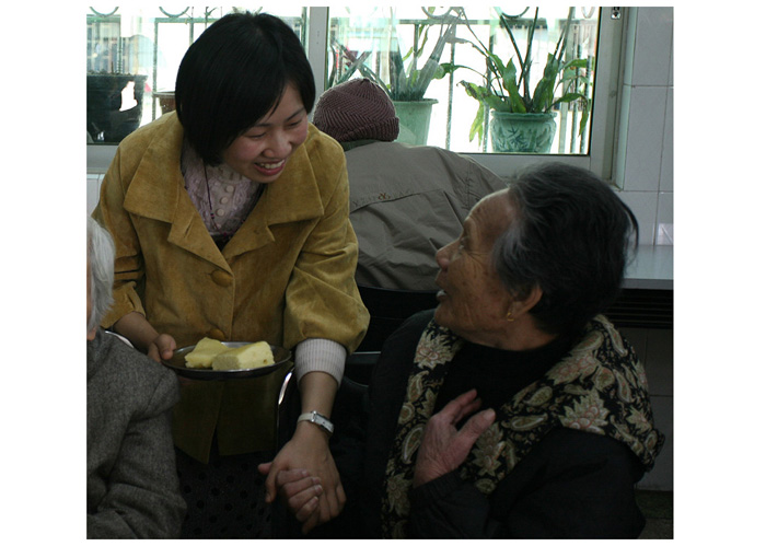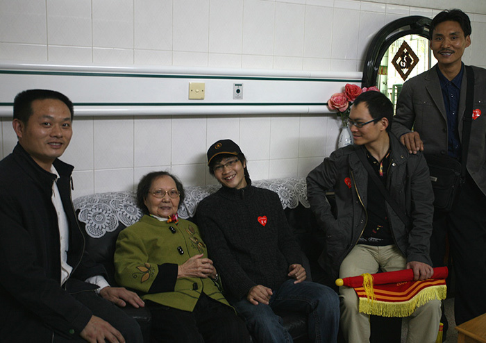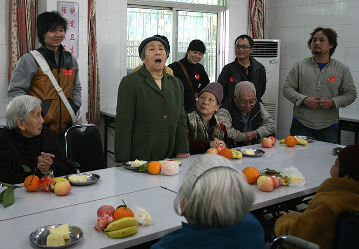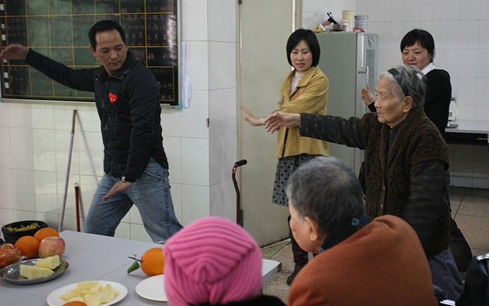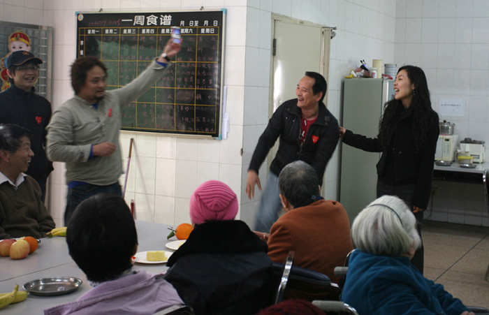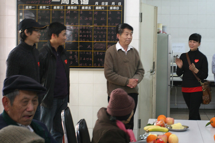 熱情的迎接我們并帶我們到4樓的老人們的活動(dòng)廳
