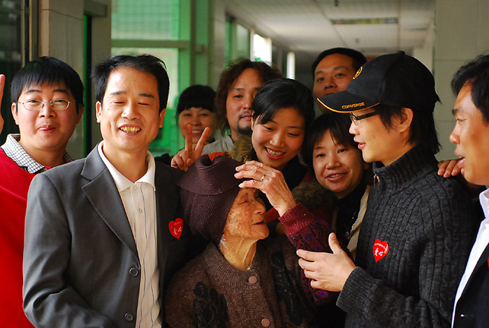 大家槍著和百歲老人合影