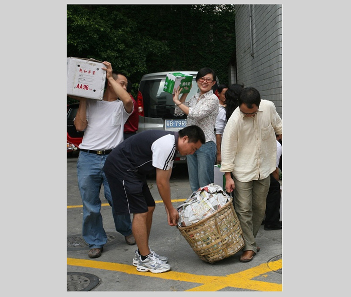 朋友正興奮激昂地搬運(yùn)給老人帶來(lái)的食品,有香焦、牛奶、水晶梨,還有生活用品紙巾。