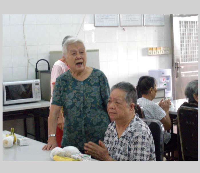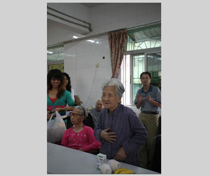 葉奶奶唱完后,一位來(lái)自廣西的老奶奶站起來(lái),拍著自己的胸懷表達(dá)她的肺俯之言,她說(shuō):你們能夠到這里來(lái)看望我們,我們真的真的非常高興。本來(lái)這里很寂靜,可是因?yàn)槟銈兊牡絹?lái)卻感覺(jué)充滿無(wú)限的生機(jī)。我希望你們能夠經(jīng)常到這里來(lái)坐坐?,F(xiàn)在,我代表我們這個(gè)頤老院的老人們,表示真誠(chéng)的感謝!”