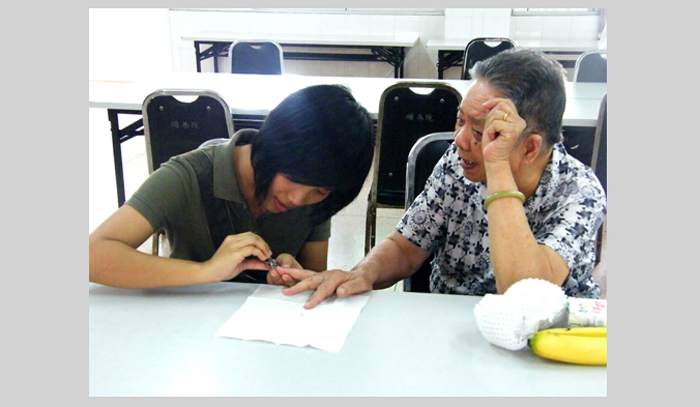 沙發(fā)布藝的小芳同學(xué),熱情的和一位年過(guò)七甲的奶奶聊起天。記得小時(shí)候,奶奶跟我講故事的時(shí)候,我總是會(huì)在不經(jīng)意細(xì)數(shù)她臉上的皺紋。一根、二根、三根,可是在此刻間,我卻永遠(yuǎn)也數(shù)不盡……
