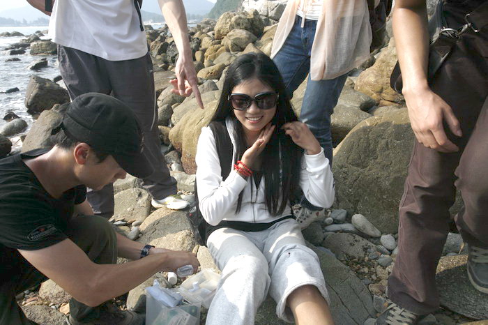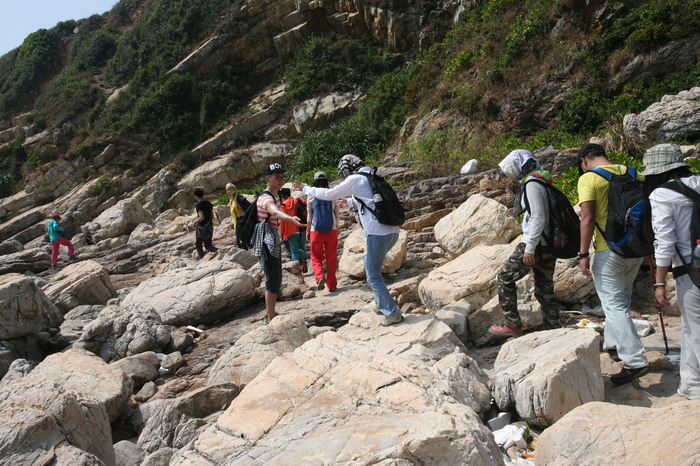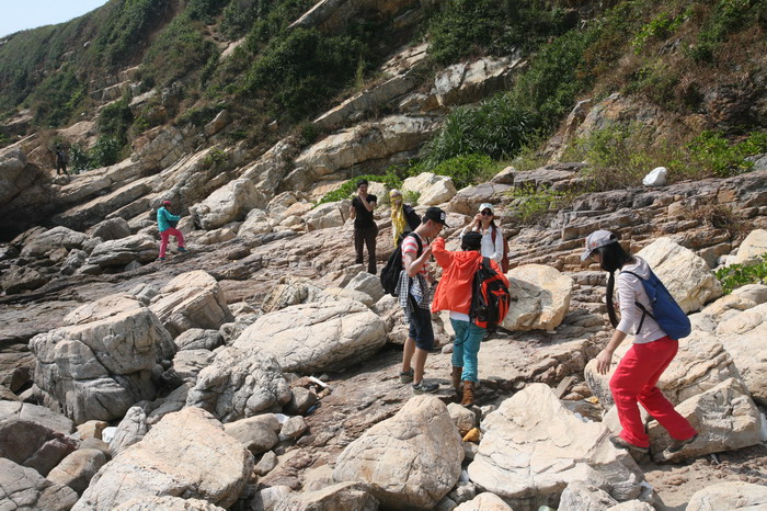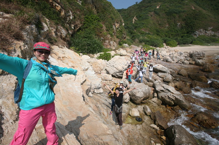 最后抵達(dá)終點(diǎn)咯,先在大石頭上休息一下,再來個(gè)大合照,因?yàn)榻K點(diǎn)快到了所以小伙伴們開始有點(diǎn)松懈咯,我們的姣姣小美女專注著看上空盤旋的直升機(jī)踩空摔跤了,不過只是擦傷,其實(shí)我想說的是,在徒步中,一定不要分神哦,很容易發(fā)生意外?。。ㄏ聢D)