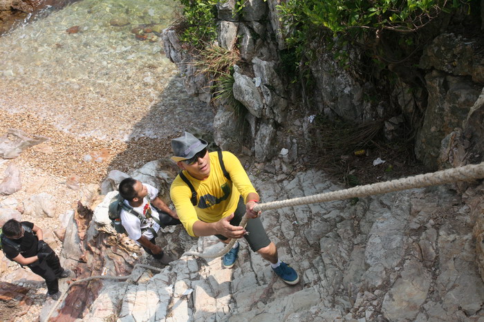 填飽肚子,補(bǔ)充完體力之后,我們又出發(fā)了,接下來是最具挑戰(zhàn)性的上坡路!第三重奏:上坡路,這一部分可是最具挑戰(zhàn)性的,很多都是陡峭的石壁,沒有多余的著重點(diǎn),只能靠著繩索往上走,體力不是太充裕的伙伴們,這個(gè)時(shí)候就最需要拉一把咯?。ㄏ聢D)