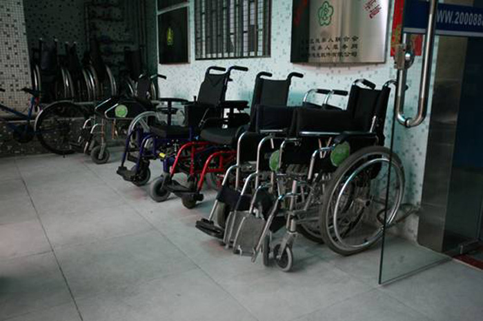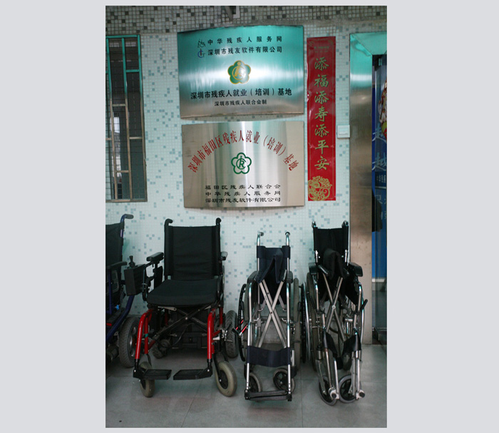 我們首先看到的是大門口擺放整齊的各式輪椅,因為在這個特殊的公司里許多人都是用它來代步的。
