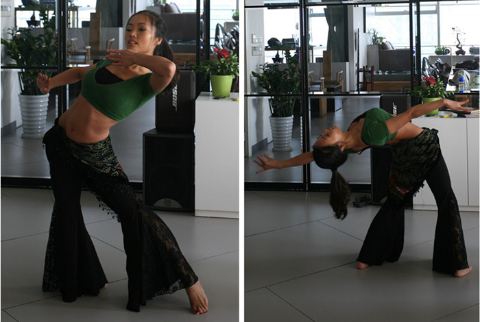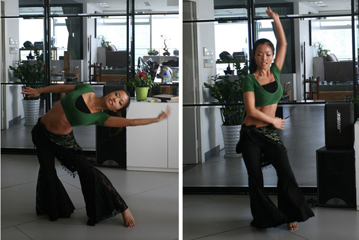 今天學習了肚皮舞的三個基本動作:水蛇手、西米、駱駝??粗趵蠋熥銎饋韮?yōu)美自如,我們也很努力的學習,但要把動作做得到位可不是容易的。(下圖)