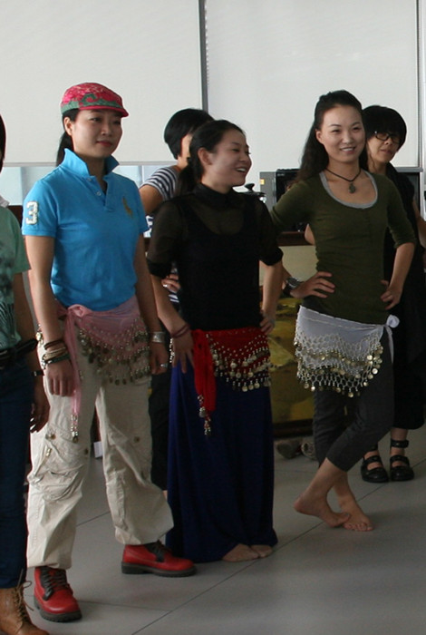 有心的王老師帶來了肚皮舞的腰巾,看這三位美女已經(jīng)躍躍欲試了。(下圖)