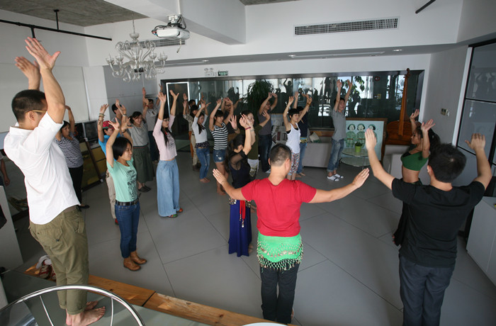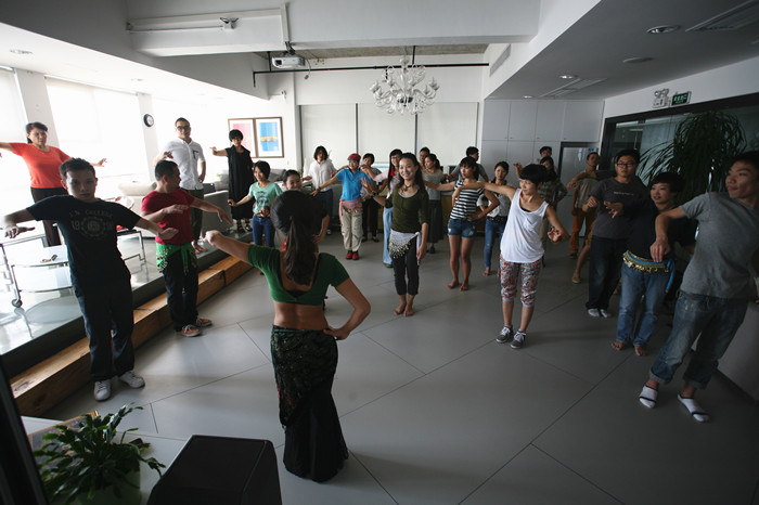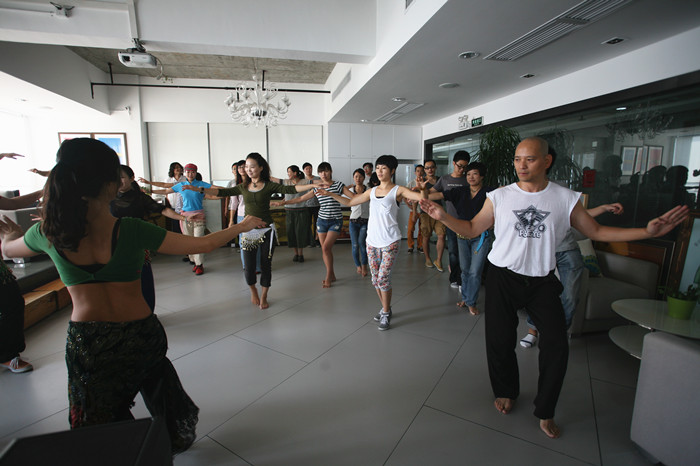 王老師說:“肚皮舞很多人以為是女人的舞蹈,其實當代肚皮舞高手不乏男性,我的老師就是中國著名的“肚皮舞國王”郭偉,網(wǎng)上有很多他的視頻,看他的表演,你會發(fā)現(xiàn)肚皮舞原來也可以陽剛帥氣?!比桌蠋熣f:“設計師要對美的事物要有獨特的敏感度,要擁有健康的生活方式,每個人都要找到適合自己的鍛煉方式。肚皮舞對于長時間坐著的設計師們是很好的鍛煉。”看三米老師學習的多認真!(下圖)