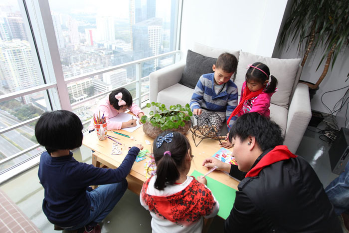 這群小朋友似乎玩的不亦樂乎,她們把小手放在桌沿上,用畫筆記錄最艷麗的色彩。(下圖)
