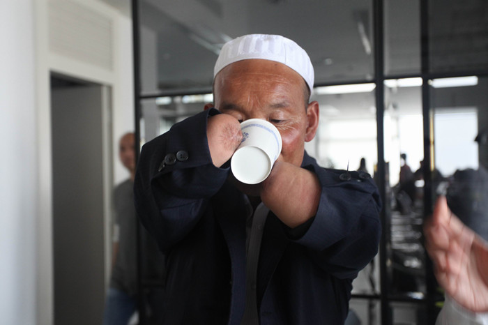 一個小女孩好奇的看著馬老師用雙肘端起水杯。(下圖)