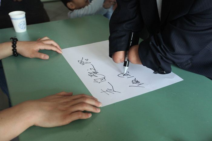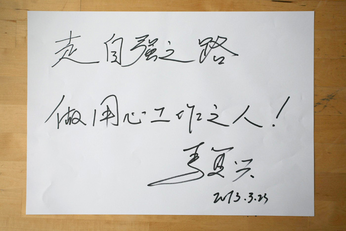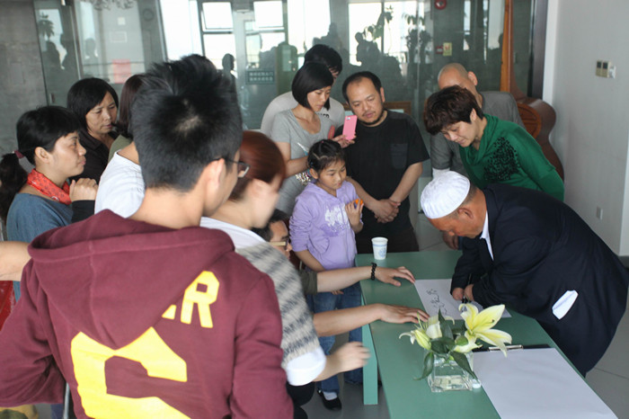 大家都興奮的看著馬老師的現(xiàn)場題詞。(下圖)