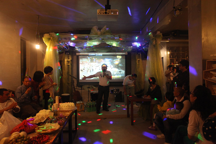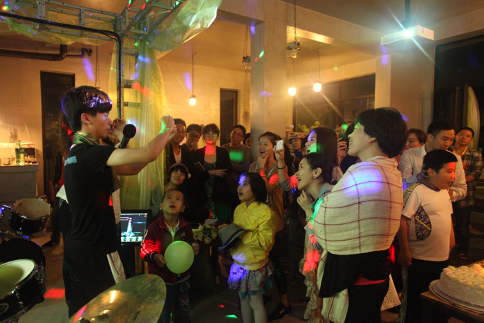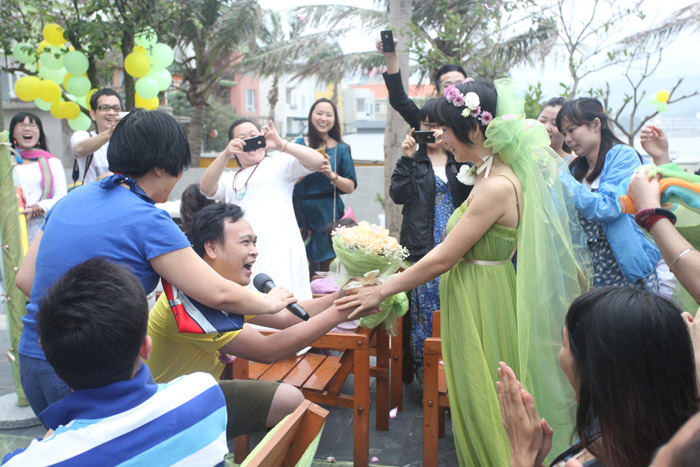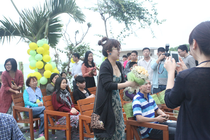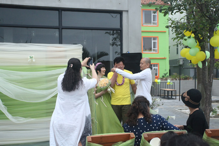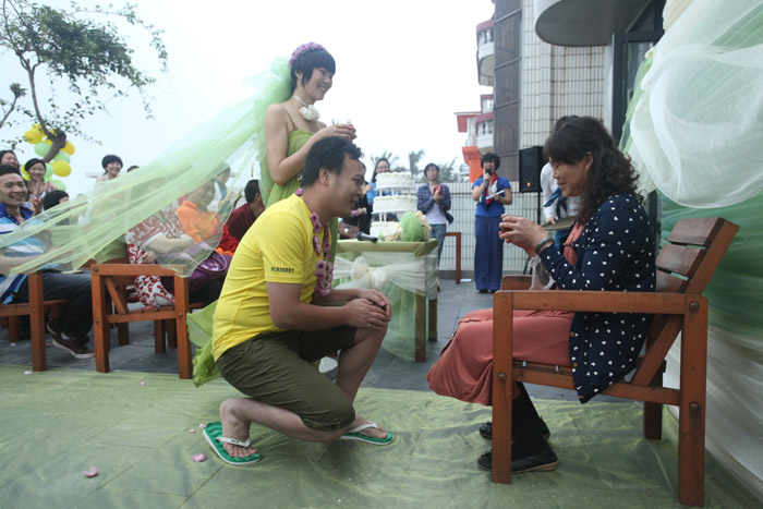 噔噔蹬蹬……男主角(白色T恤阿狗哥)上場,板栗姑娘(紅色裙子)正在給伙伴們介紹新郎哥。(下圖)