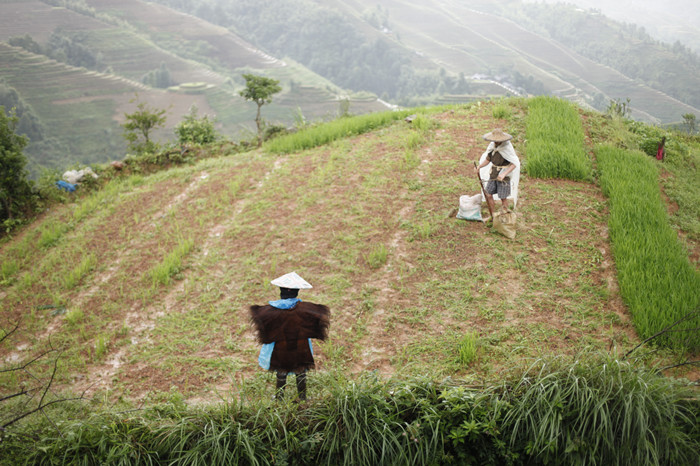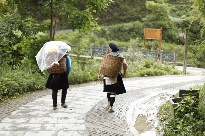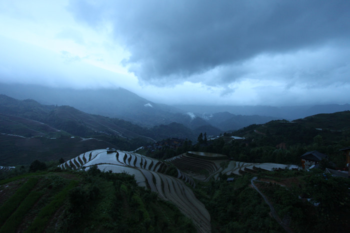9日,趕往有著“世界梯田之冠”美譽的龍脊梯田…… 到了山下已是傍晚,還要走一個多小時的山路,還好請了瑤族的背包大姐把我們的行李放在她的背簍里。帶路送我們?nèi)ツ康牡亍谰皹?。始終在下小雨,大姐細心的把行李都用塑料布蓋好。山路旁的小店還是燈火輝煌,隱約看到遠處的空中樓閣的燈光,路旁都種滿了水稻,耳邊還有陣陣的蟲鳴聲音。這一路走來倒是領(lǐng)略了梯田的夜景。(下圖)