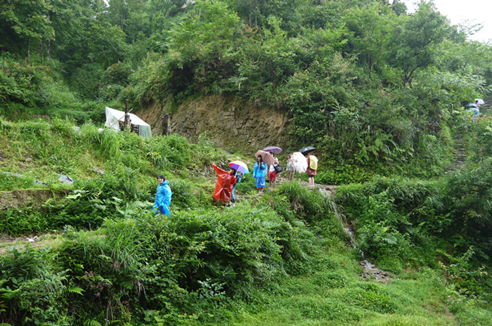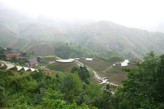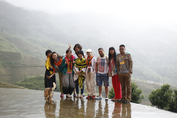 雖然我們這次去的時候天公不是很作美,冷風(fēng)中還夾雜著小雨,但是因為同去的是這么一群可愛的人兒,大家一路談笑也就使不足的成份減少了很多,絲毫不被這樣的天氣影響到什么。反而這樣煙雨迷朦似乎更有些許韻味。特別是穿著雨衣辛苦爬了1個小時到達最佳觀景區(qū)一睹龍脊梯田的壯美,在煙霧環(huán)繞下的千層梯田比平時更多了一種令人神往的韻味,讓人不禁感慨天人合一的神奇......