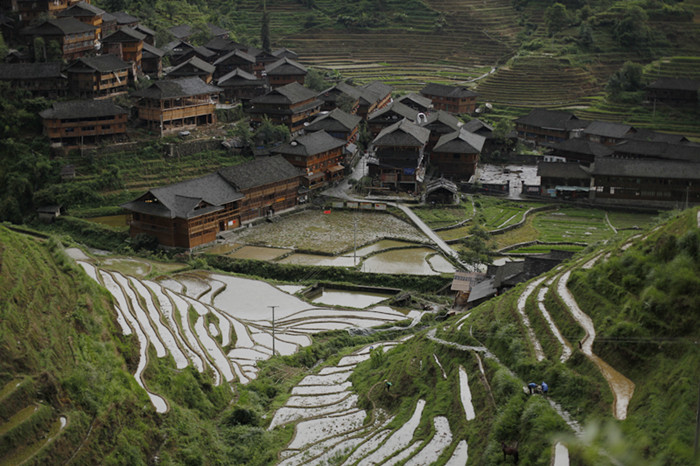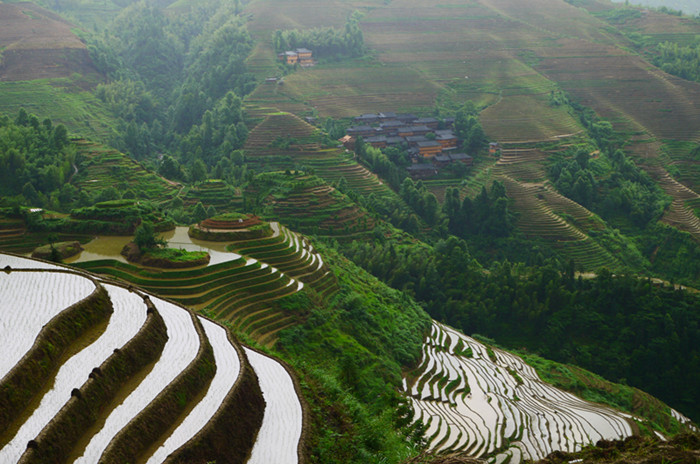 正值龍脊梯田春耕時節(jié),梯田上的耕犁忙起來,梯田猶如一片片明鏡,映襯著不同的景致,形成一個色彩斑斕的天堂。這如詩如畫的龍脊梯田始建于元朝,完工于清初,距今已有650多年歷史。因山勢太陡,最大的田不過一畝。這是勞動人民智慧和力量完美體現(xiàn)。我們驚訝!更加敬仰?。ㄏ聢D)