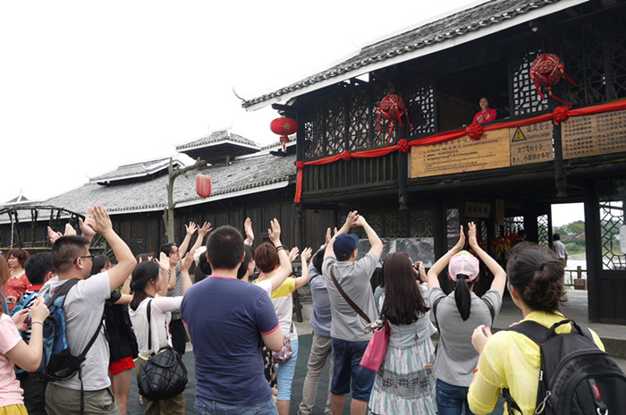 岸邊歌臺舞樓上的姑娘在載歌載舞。她們身著鮮艷的民族服飾,正以充滿濃郁民族風(fēng)情的歌舞歡迎著遠方客人的到來。(下圖)