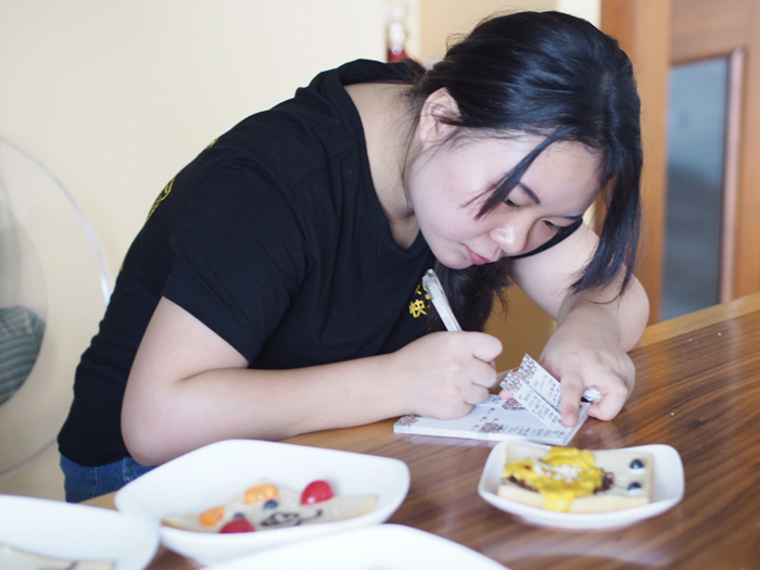 如何把面包當成畫布?!且看今天的“主筆”小敏童鞋的示范。工欲善其事必先利其器,“畫布”、“筆”、“顏料”,齊了。