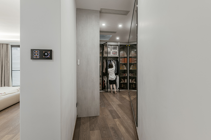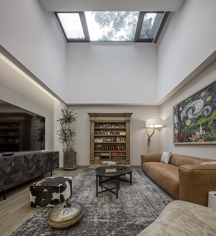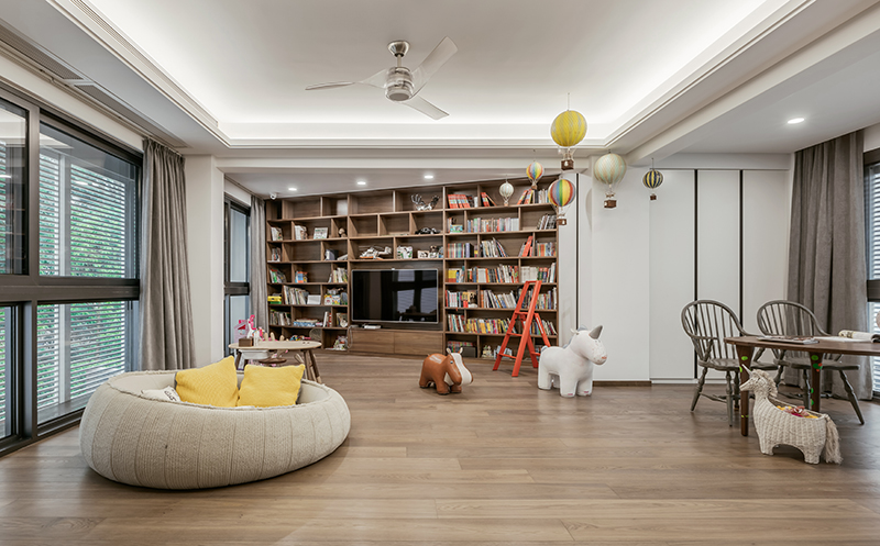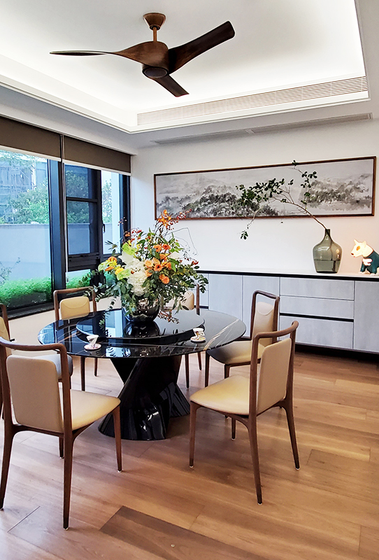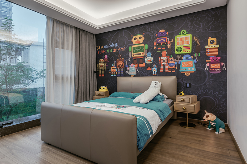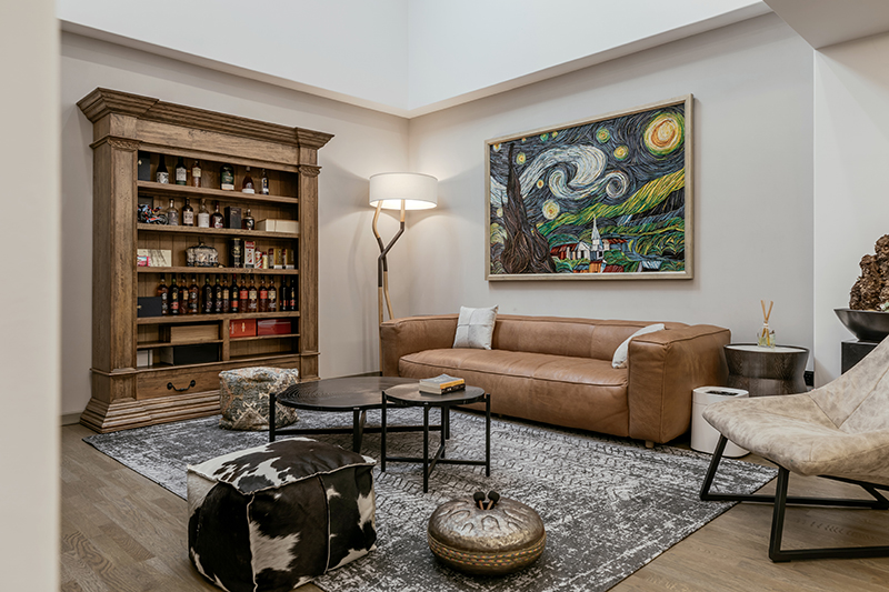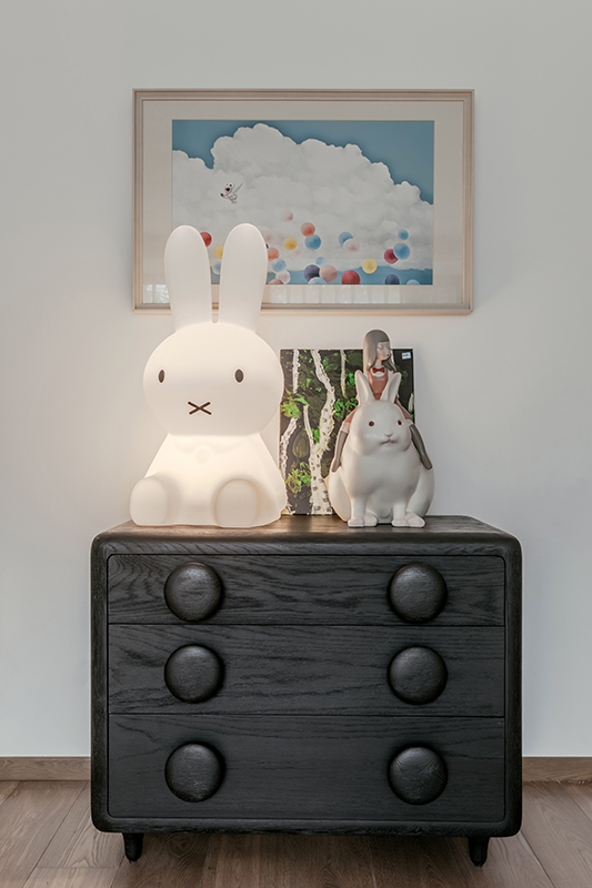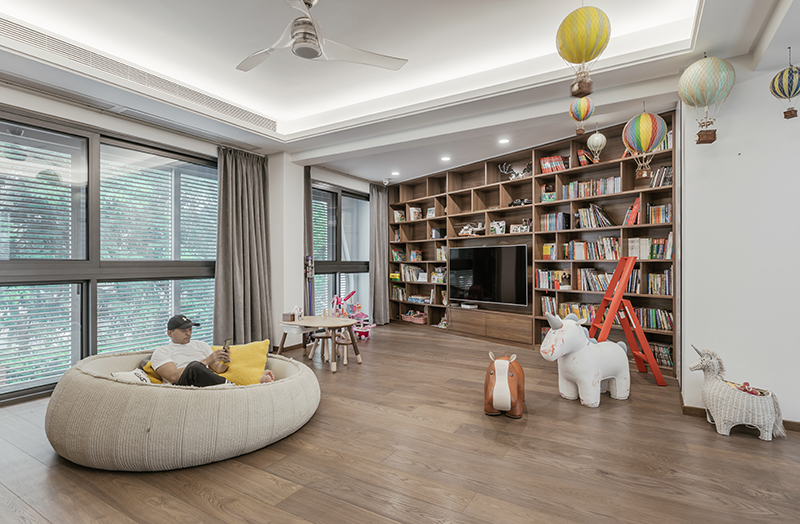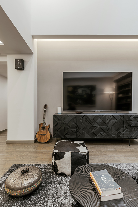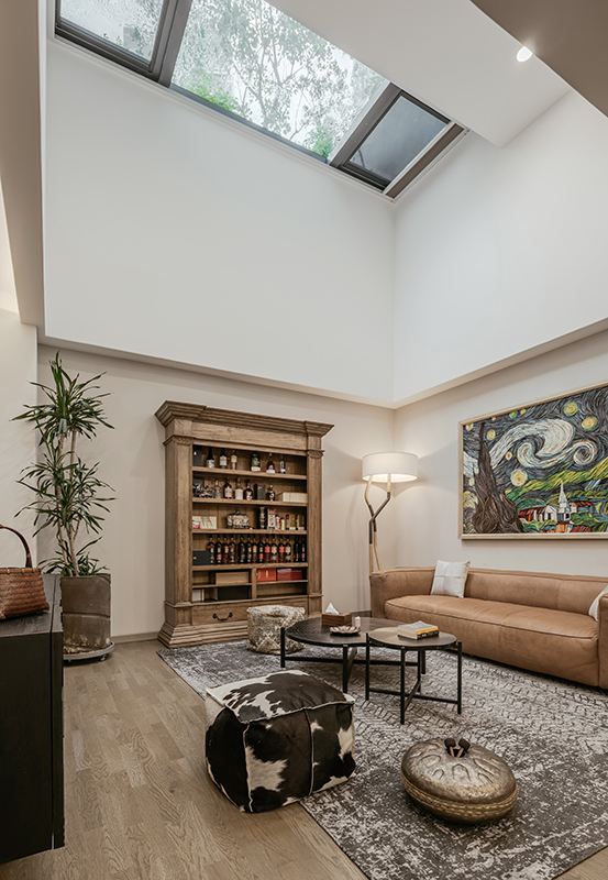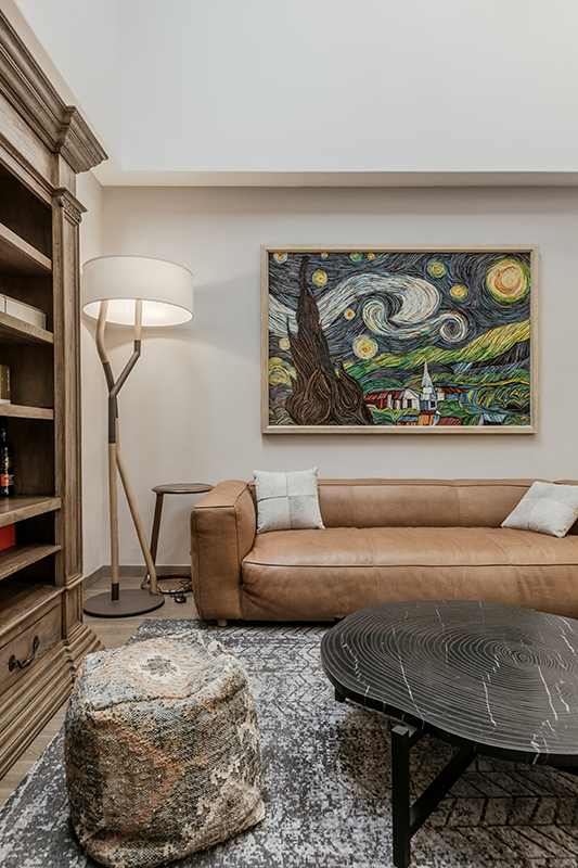 中國的別墅大都從地庫回家,解決地庫采光及通風是一大問題。這套房,我們在一樓前、后花園都開了天窗,通過遙控定期開窗通風。男主人喜歡梵高,為此我們設計了一處星空區(qū),掛上梵高紙質的《星空》,每晚仰望星空,喝著小酒,快意人生。