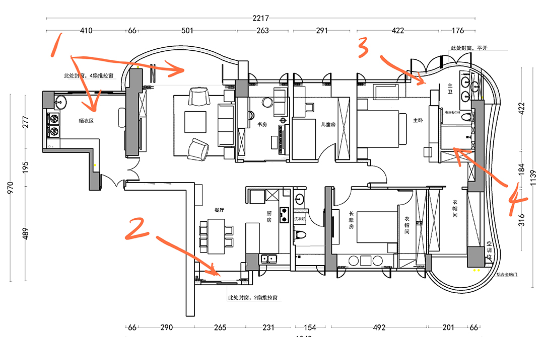 3、原主衛(wèi)陽臺納入室內(nèi),成為主衛(wèi)門,洗漱臺得以靠近窗邊,早上洗漱滿眼風(fēng)景(4為原入口)