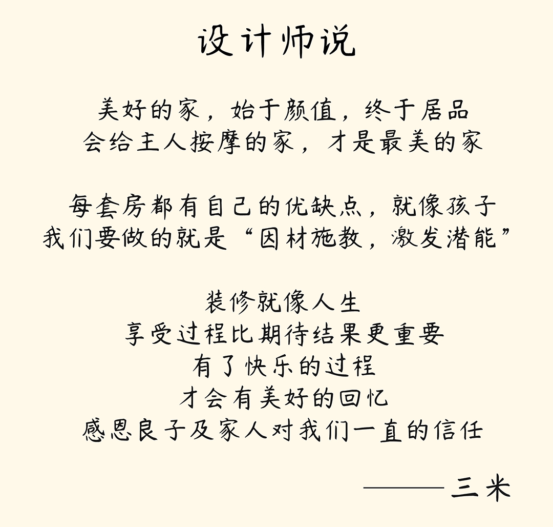 這些日日夜夜息息相關(guān)的諸多細(xì)節(jié),無一不決定著舒適性和美觀度。只有充分用心貼近生活,又擁有豐富經(jīng)驗(yàn)的他們才能勝任!除專業(yè)之外,老師更是一路幫我披荊斬棘,各種出面解決問題,動用自己的人脈關(guān)系,為我節(jié)省資金。無時(shí)無刻不設(shè)身處地。這種溫度,不是每個設(shè)計(jì)師和老板都能有的!三米團(tuán)隊(duì),真正的刷新了我對家裝界的認(rèn)識!